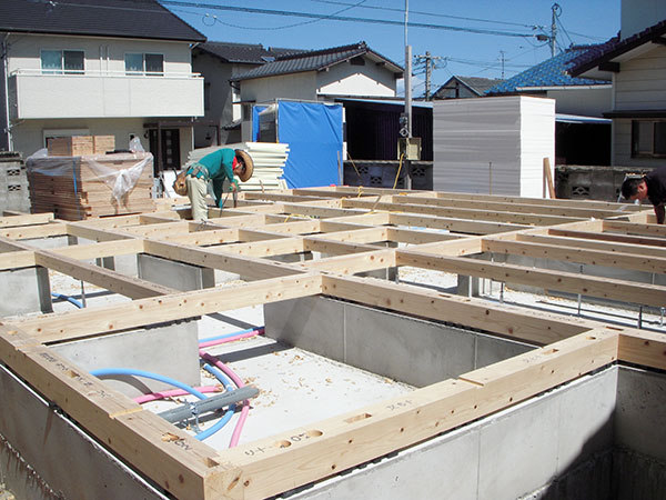 基礎の工事が終了しますと、木工事に移ります。土台敷きは木工事の初めの工程になります。