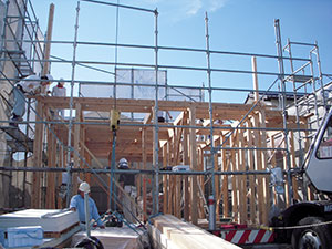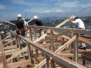木造住宅の建設工事が進み、梁や柱などの骨組みをつくっていきます。