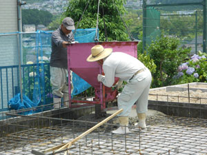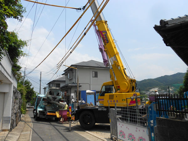 かくはん車でコンクリートを運び、運んだコンクリートをクレーンで吊って流していきます♪