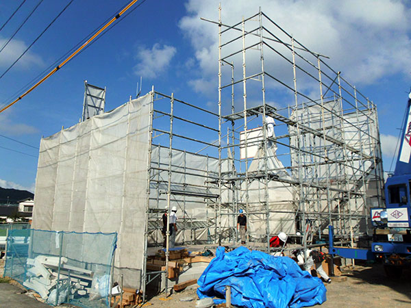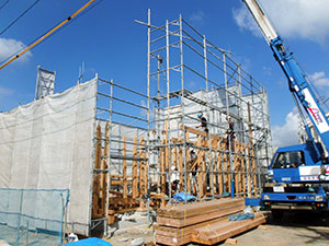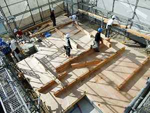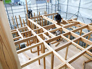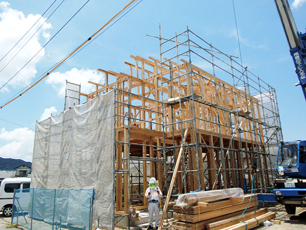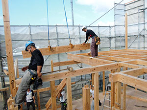 木造住宅の建設工事が進み、梁や柱などの骨組みをつくっていきます。