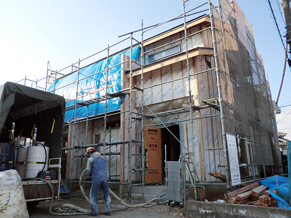 宇美町明神坂K様邸の幸せづくり状況:吹付け断熱♪