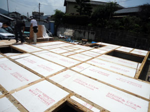 断熱材を敷きつめた後に、木材の板を隙間なく敷きつめていきます。