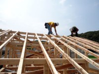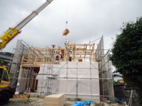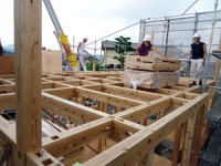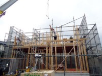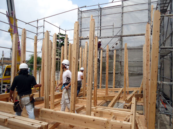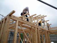木造住宅の建設工事が進み、梁や柱などの骨組みをつくっていきます。