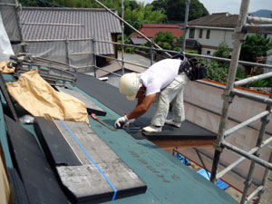 最後に、屋根の防水シートを貼って家を守ります♪
