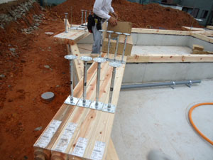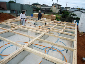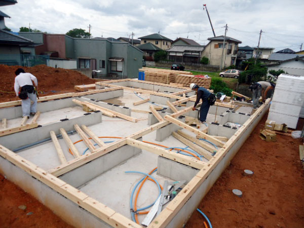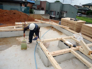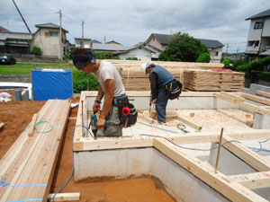 基礎コンクリートが終わり、しっかりした土台が完成したあとは土台敷きという作業です。