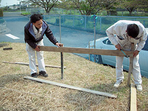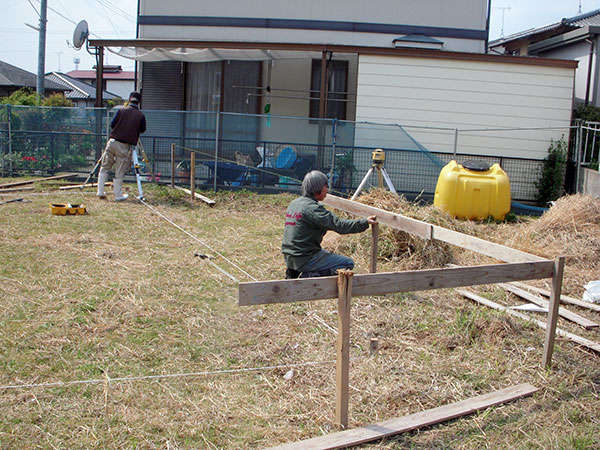 遣り方とは、基礎工事に着手する前に、柱と壁の中心線、内壁や外壁面の高さの基準となる水平位置などを