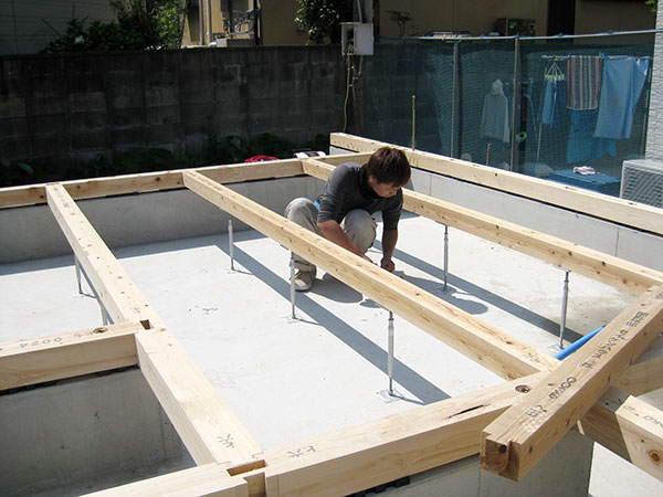 基礎の工事が終了しますと、木工事に移ります。土台敷きは木工事の初めの工程になります。