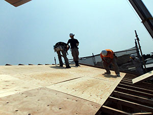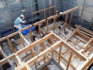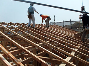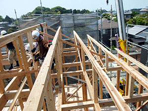 木造住宅の建設工事が進み、梁や柱などの骨組みをつくっていきます。