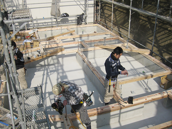 断熱材を敷きつめた後に、木材の板を隙間なく敷きつめていきます。