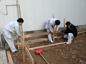 基礎工事に着手する前に、柱と壁の中心線、内壁や外壁面の高さの基準となる水平位置などを