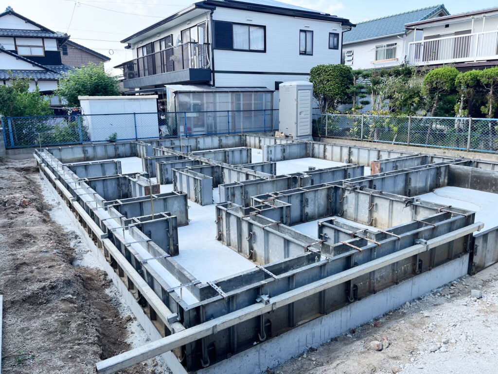 ベタ基礎は、底面と立ち上がり部分の鉄筋コンクリートが一体となった基礎です!
