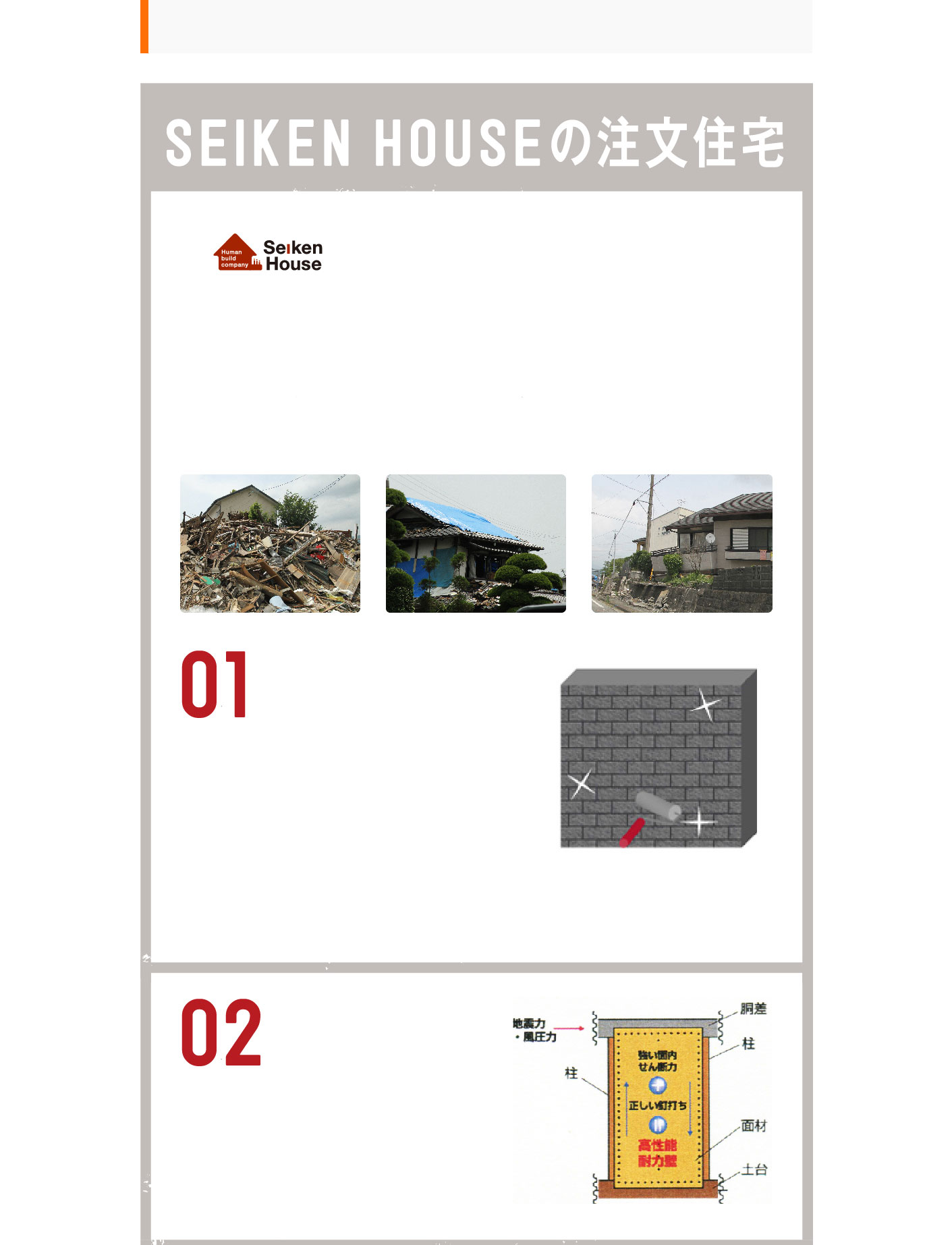セイケンハウスの注文住宅は 熊本地震をきっかけに 基礎 から家づくりを見直しました 基礎工事 ホームメイキャップ塗装 2階から落としても割れない程の強度。基礎工事の「ホームメイキャップ塗装」を採用。外観の美観を整えるだけでなく、コンクリートの中性化を実現。地震などの外力による破壊を防ぎます。 基礎の長期耐久性を実現 耐力面材ハイベストウッド 壁倍率4.0の高耐震・高耐久。面材工法により、壁面全体で地震力・風圧力を受け止め、バランスよく分散し、軸組の接合部への力の集中を緩和します。