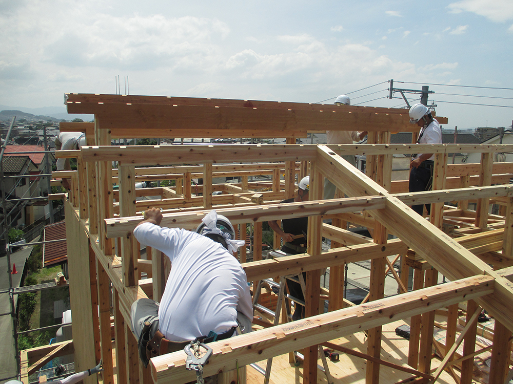 須恵町 T様邸の幸せづくり状況です~♪ 棟上げの様子です! 朝からベテランの大工さん大集合! およそ1000本もの木を一日で一気に組み上げます! 耐力面材『ハイべストウッド』を施します! こ耐...
