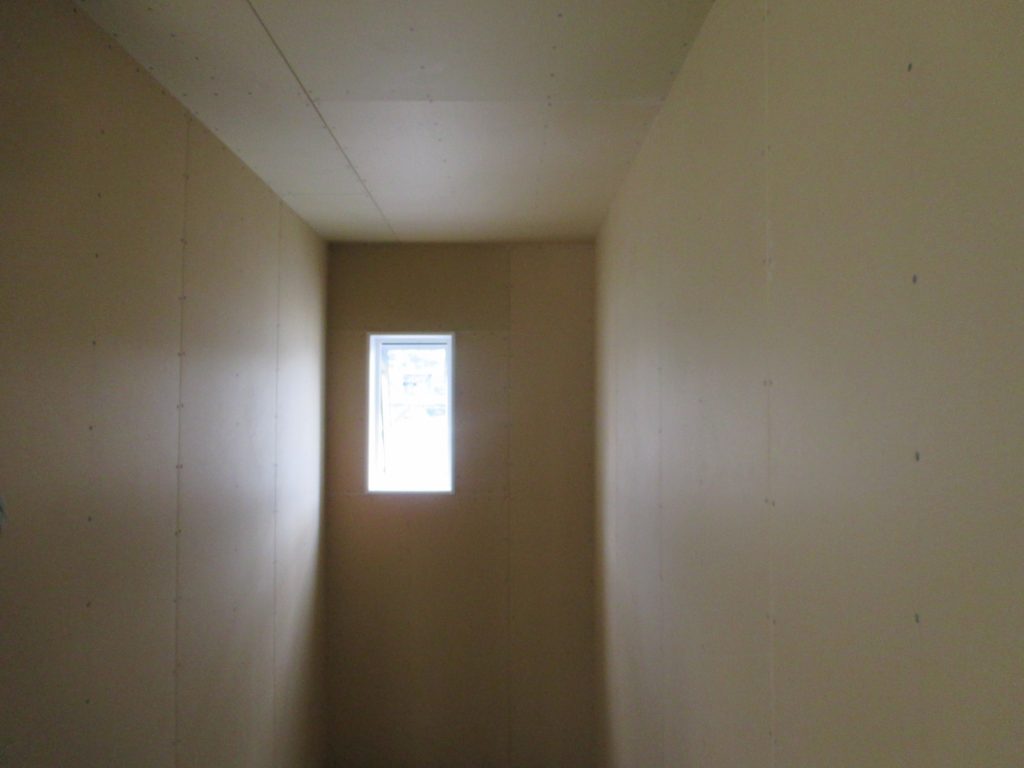 断熱材を吹付け、電気配線などを行った後にビスを等間隔に打っていき、プラスターボードを貼ります!