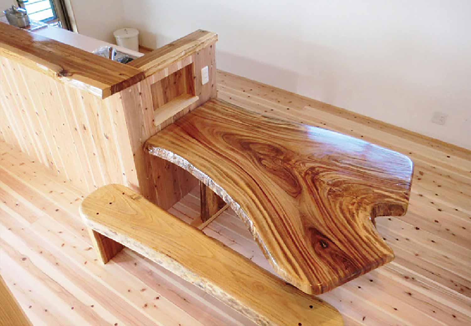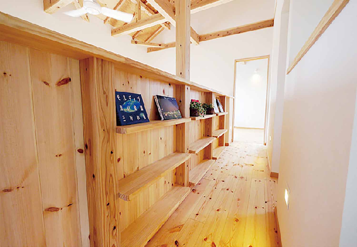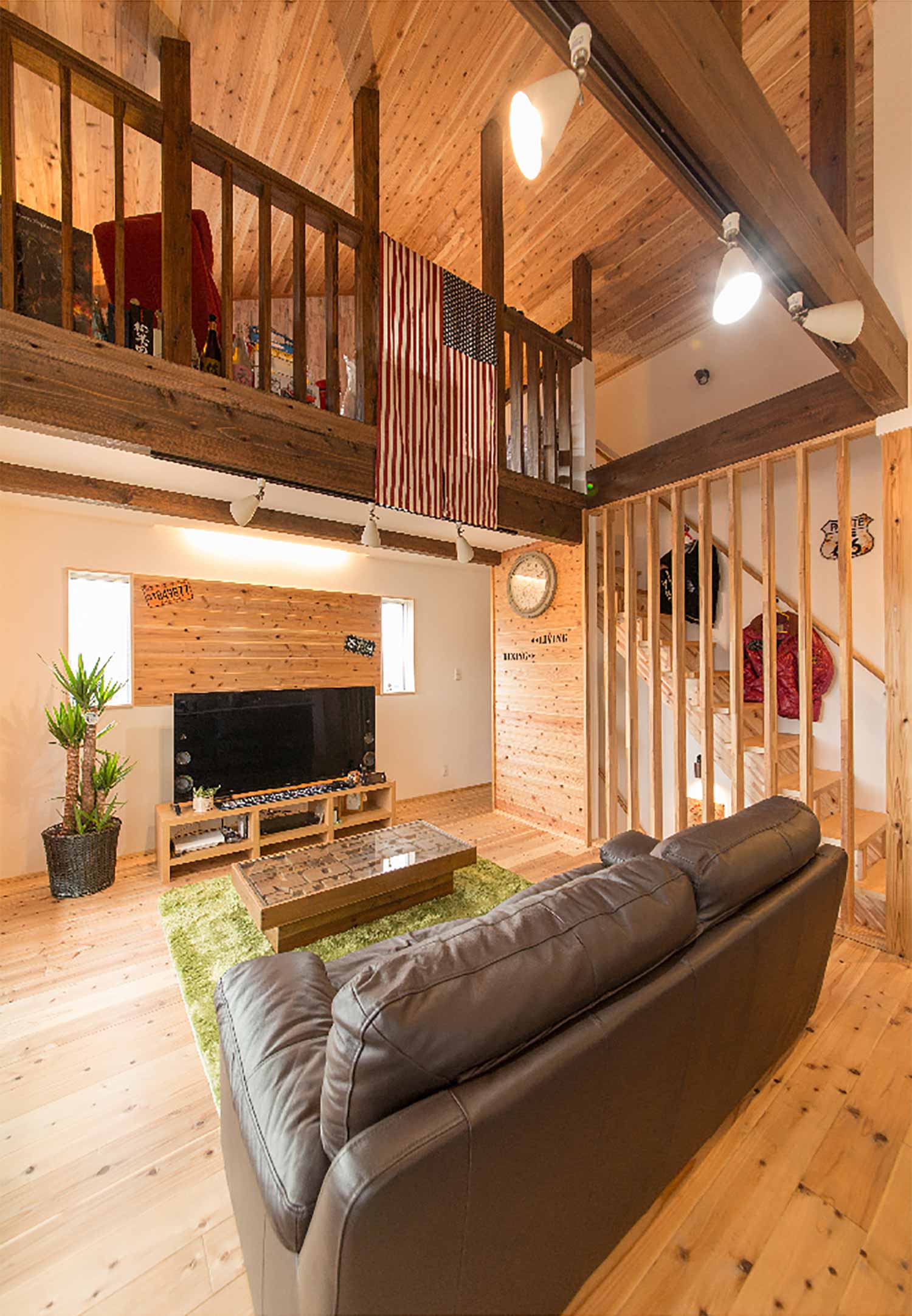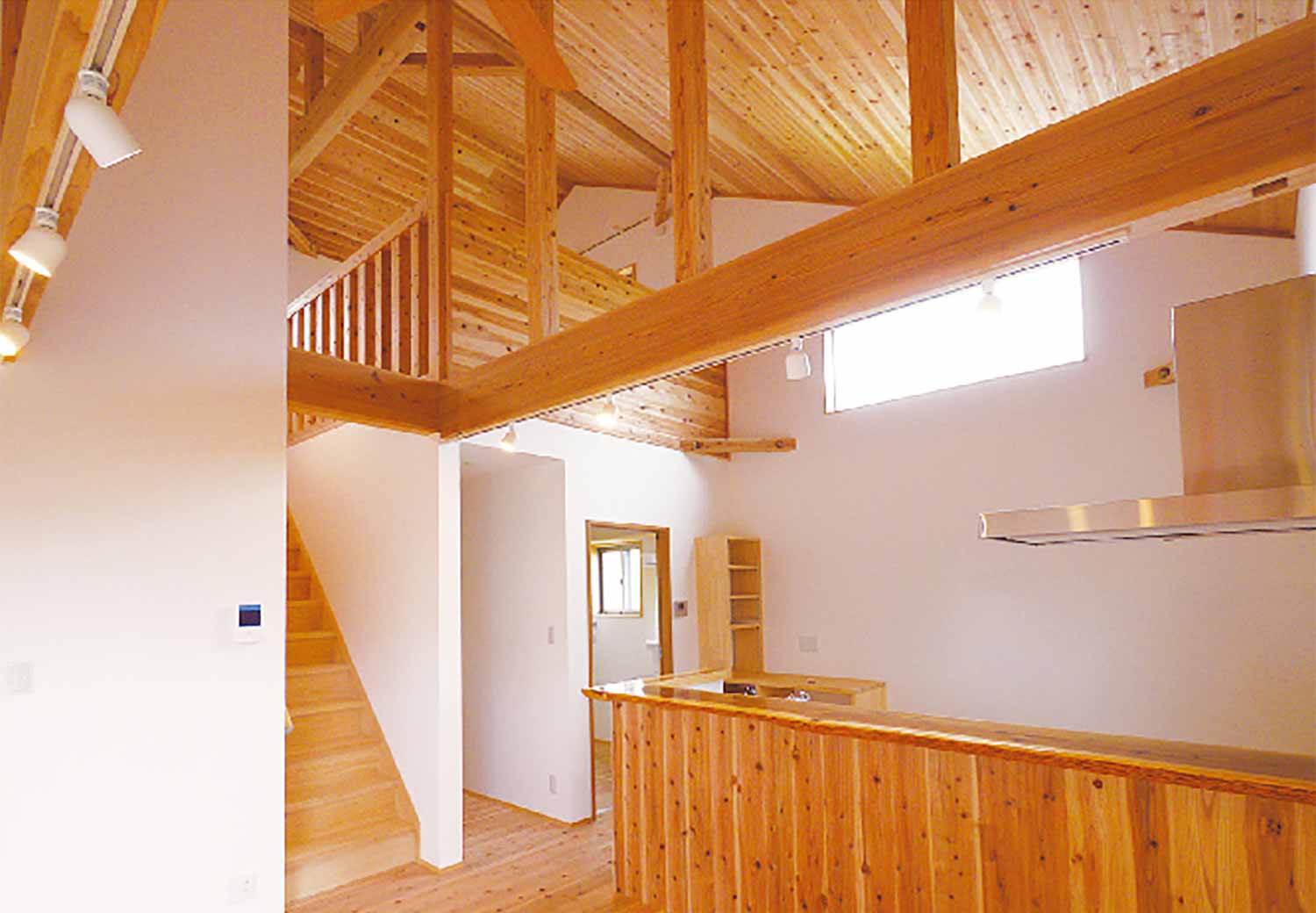 屋根裏としてデッドスペースになっているスペースを使用し、 開放的な空間を演出する勾配天井の吹き抜け。吹き抜けには天然の木目をそのままに、ぬくもり溢れる飫肥杉をふんだんに使用し安らぎの空間。