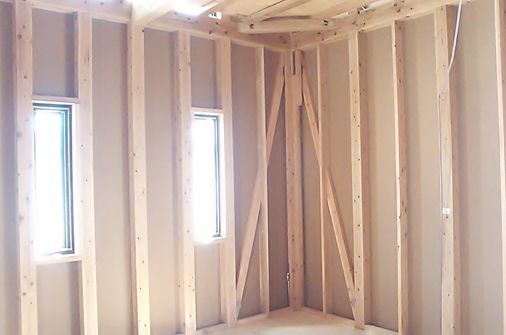 須恵町新原O様邸の幸せづくり状況です♪ 木工事中です! 棟上げが終わったところで、間柱、筋交いを入れています! サッシも取り付けられ、たくさんの窓から光が差し込んでいます! ...