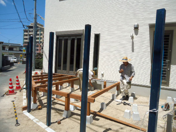南区井尻Y様邸のウッドデッキ組の様子です♪ まだ床板は敷かれていないですが、 どんなふうに仕上がるのか楽しみですね♪