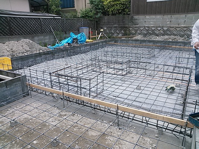 古賀市F様邸の基礎配筋工事が行われています♪ 均一に鉄筋が並べることにより、大事な基礎の強度を保ちます。     次はコンクリート打設です!