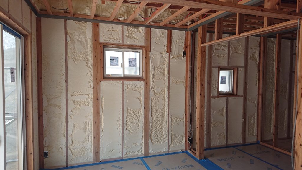 志免町I様邸の幸せづくり状況です♪ 吹付断熱工事完了です! 断熱材は、快適さ、省エネルギー効果だけでなく、家の耐久性にも大きく関りがあります! 次の工程に進みます~♪