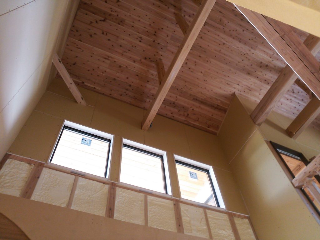宇美中央6号地 Y様邸の様子です~♪ 木工事が行われています! 天井の杉板張りが完了しています! 階段も進んでいます!! ボードを貼り、この上にパテを施してクロスを貼ります! 次の工程に進みま...