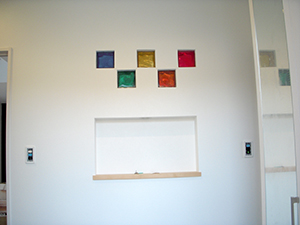 宇美町桜原T様邸のクロス工事が完了しました♪ 壁にはカラフルなガラスブロックが!! ガラスブロックは光が当たった時にとっても綺麗な演出をしてくれるんです。 棚の奥もレンガ調のアクセントクロスでとってもオシャレですね♪ シ...