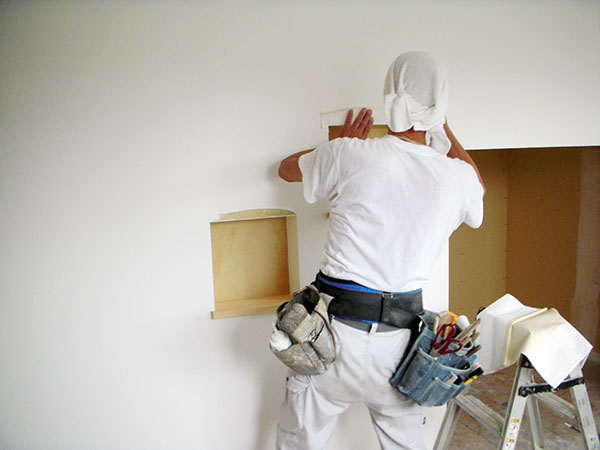 志免町K様邸のクロス工事の様子です♪ 下地となるボードを貼り、凹凸のある部分をパテで均一にしていきます。 それから、クロスを貼っていきます。 左右にある飾り棚が素敵ですね♡ 竣工まであともう少し!! 楽しみです♡