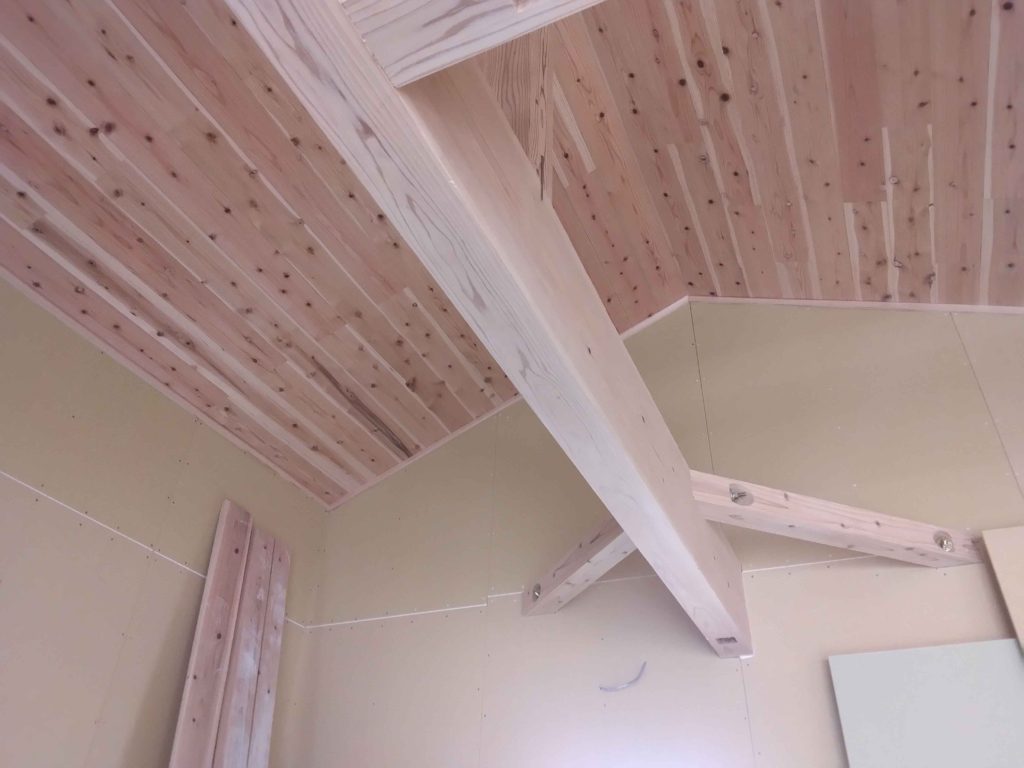 宇美町N様邸の幸せづくり状況です♪ ボード貼り中です! 断熱材を吹き付け、電気配線などを行った後にビスなどを均等間隔で打っていきプラスターボードを貼ります! 天井板貼りも終わってます! 木の温もりを感じられ...