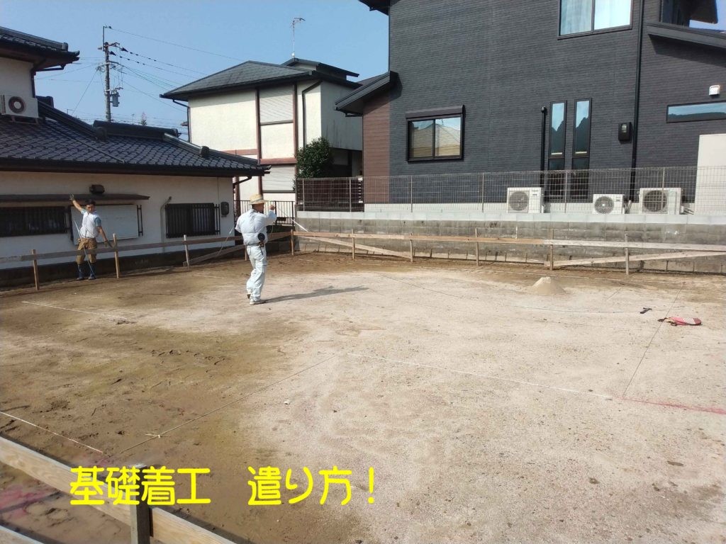 三養基郡G様邸の幸せづくり状況です! 基礎工事が始まりました! 基礎工事の初めに地面を掘る前に行う位置出しを遣り方と呼びます! 木の杭を地面に打ち込み、貫き板を固定して作ります 地盤を掘削する作業、根伐り(掘り方)まで進...