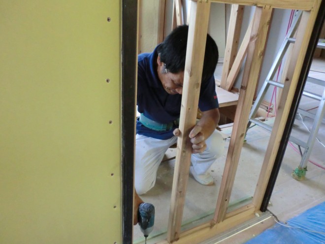 須恵植木M様邸の造作工事中の様子をご紹介♪     室内建具の枠を取り付けてる最中ですヾ(*´∀`*)ノ   石膏ボードも並行して貼られています♪   これから天井の杉板が施工され...