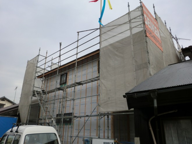 須恵町旅石O様邸の幸せづくり状況:外壁シート工事