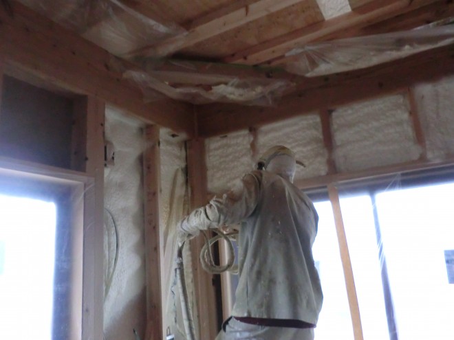 須恵町3号地F様邸のアクア吹付け工事が行われています♪   外観だけでは、中で何が行われているかはわかりませんが・・・ 作業中でした^^   アクアフォームは高い断熱性と気密性があり、 また、現場で吹...