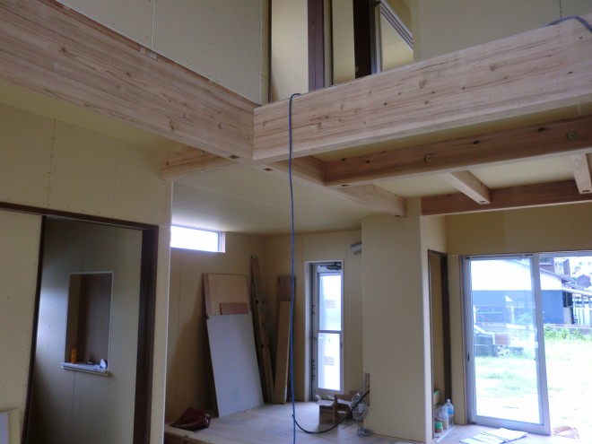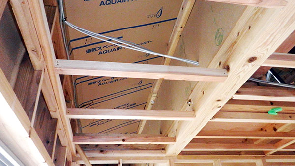 須恵町6号地S様邸の内部造作のようすです! 天井の杉板張り・建具取り付けが着々と進行中♪ 天井は杉板のあらわしになっていて、いい仕上がりです♡ クロスが貼られるのが楽しみですね! 次回もおたの...