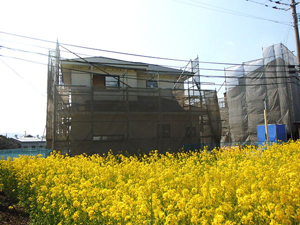 須恵町S様邸の外壁工事の様子です♪ 外壁が完了して、足場が解体されるのが楽しみですね。 向かいに菜の花畑がすごく綺麗です!! これから毎年、綺麗な景色が見れる素敵なお家になりますね♪