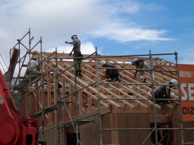 8月21日、須恵5号地N様邸の棟上げが行われました♪     木造住宅の建設工事が進み、梁や柱などの骨組みをつくっていきます。 およそ1000本もの木を1本1本組み立て、1日で一気に組み...